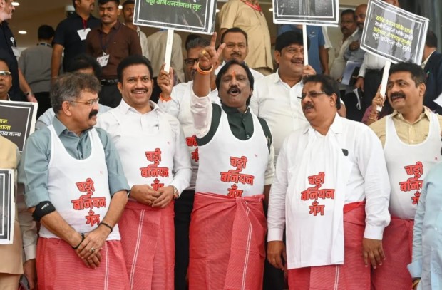 सध्या राज्याच्या विधिमंडळाचं पावसाळी अधिवेशन सुरू असून आज विरोधकांनी आक्रमक पवित्रा घेत अनोख्या पद्धतीने आंदोलन केलं. महाविकास आघाडीमधील राष्ट्रवादी काँग्रेस (शरद पवार), शिवसेना (ठाकरे) आणि काँग्रेसच्या आमदारांनी एकत्र येत अंगात बनियान घातली होती. कमरेला टॉवेल गुंडाळत सरकारच्या विरोधात घोषणाबाजी केली. आंदोलनात विधानपरिषदेचे विरोधी पक्षनेते अंबादास दानवे, राष्ट्रवादी काँग्रेसचे आमदार जितेंद्र आव्हाड, राष्ट्रवादी कॉंग्रेसचे नवे प्रदेशाध्यक्ष शशिकांत शिंदे, सतेज पाटील, महेश सावंत या आंदोलनात सहभागी झाले होते. यावेळी अंबादास दानवे म्हणाले की, चड्डी बनियान गँगने महाराष्ट्रात हैदोस घातला आहे. कँटिनमध्ये जाऊन आमदार कर्मचाऱ्याला मारहाण करतात. कुणी सिगारेट पिताना सुटकेसभर पैसे जगाला दाखवत. कुणी चड्डी-बनियानवर घरात बसून ओम फट म्हणतं. चड्डी बनियान गँगची दहशत पूर्वी महाराष्ट्रात होती. ही गँग शेतात, वस्त्यांवर दरोडे टाकायची. आताची चड्डी बनियान गँग महाराष्ट्रावर दरोडा टाकण्याचे काम करत असल्याचा घणाघाती आरोप त्यांनी केला.